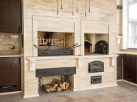 Вся печь отделана благородным травертином светлых оттенков, придающим стильный вид всему комплексу. Порталы для контраста отделаны натуральным мрамором. Особенную изюминку проекту обеспечивает обвязка из термодерева. Поясок, столешница и полка изготовлены из натурального гранита.