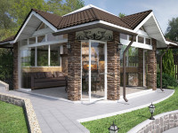 Открытая беседка выполнена в форме шестиугольника. Габариты помещения: 6х6 м. Общая площадь помещения 30 кв.м. Помещение рассчитано на 12 человек. Благодаря безрамному остеклению можно отдыхать в этой беседке круглый год.